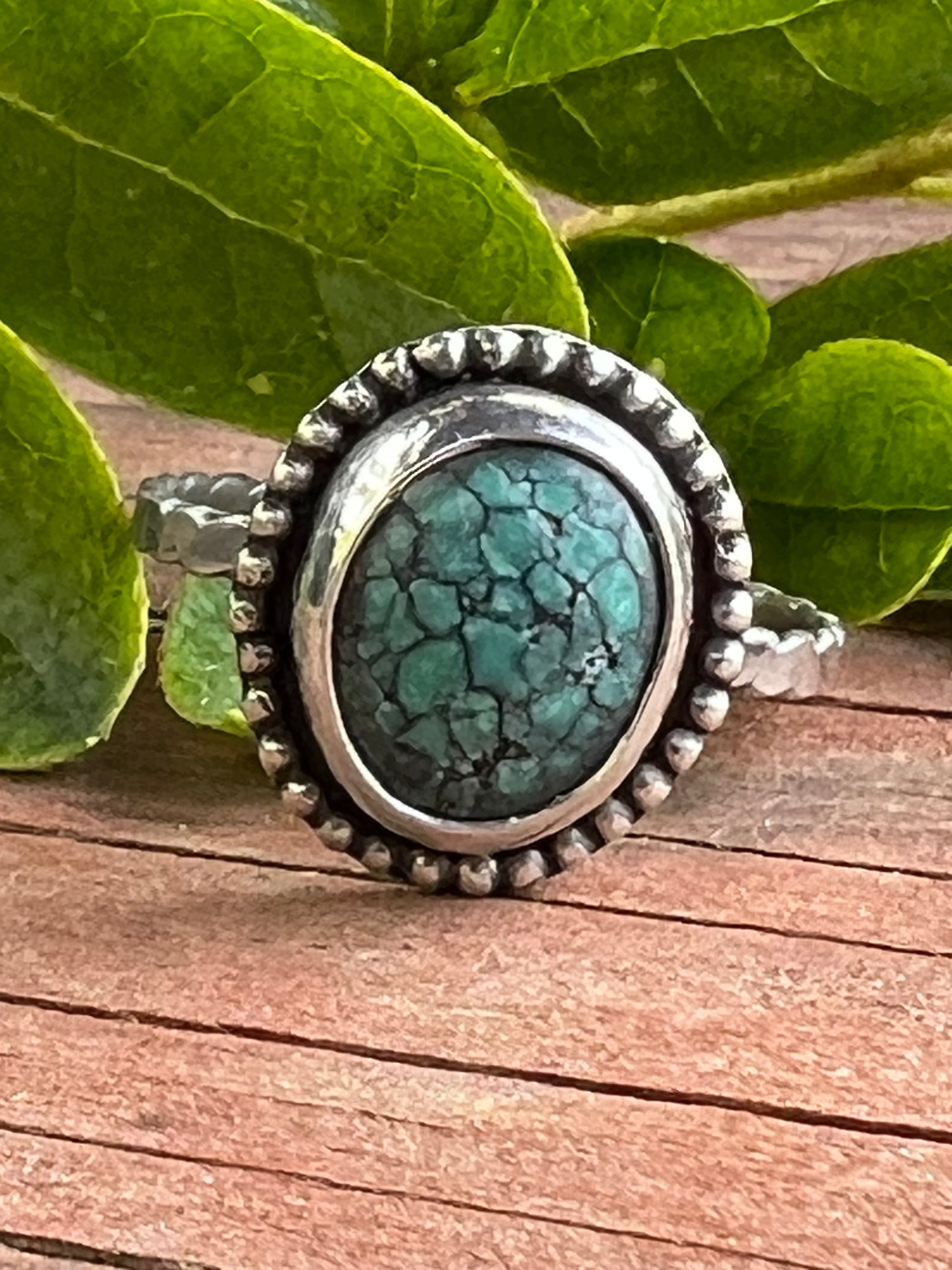 Handmade, one of a kind .925 Sterling Silver and genuine Turquoise ring with beaded edge and rope style band, size 8.