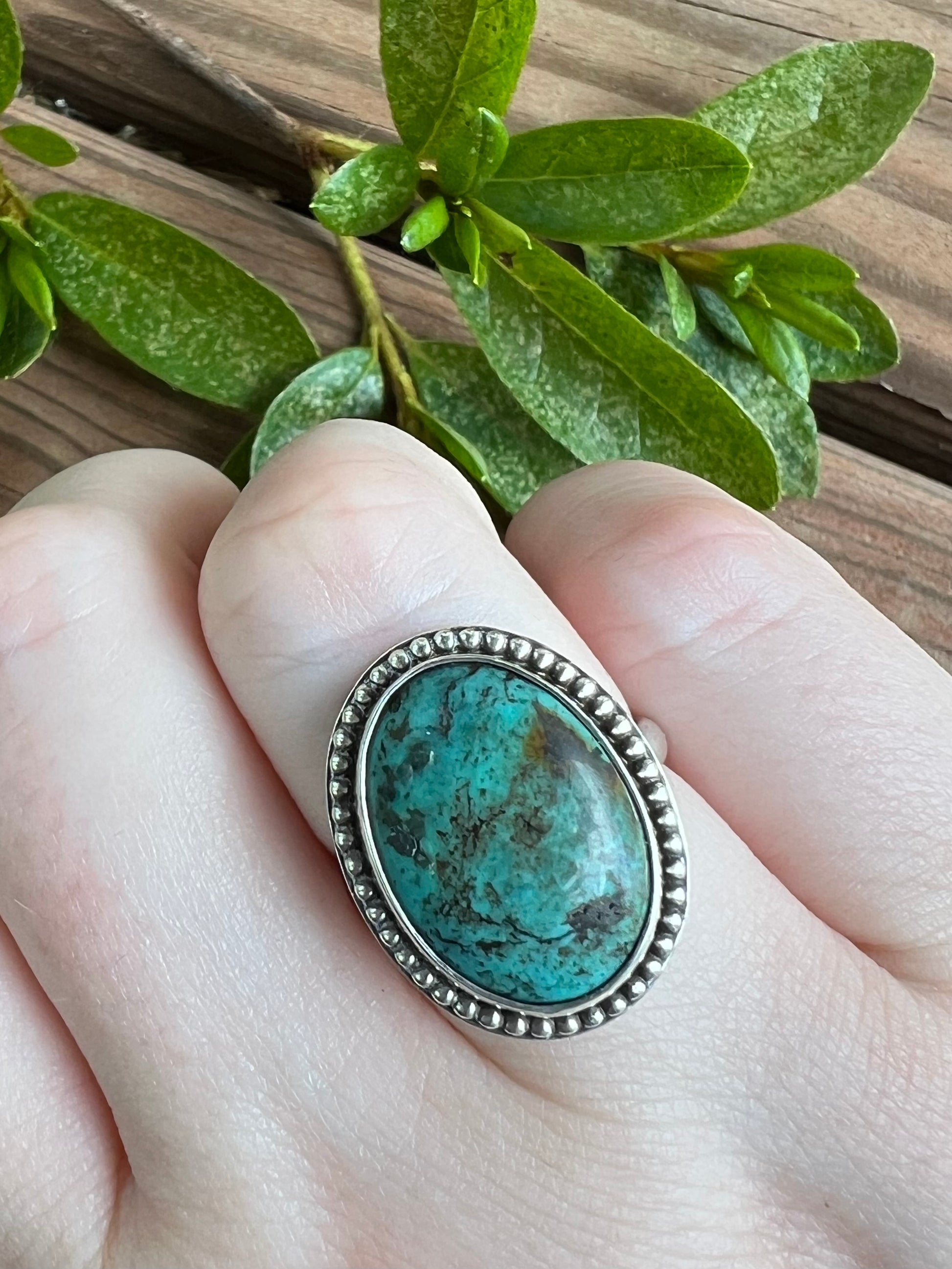 Handmade, one of a kind .925 Sterling Silver and genuine Turquoise ring with beaded edge detail, size 7.5.