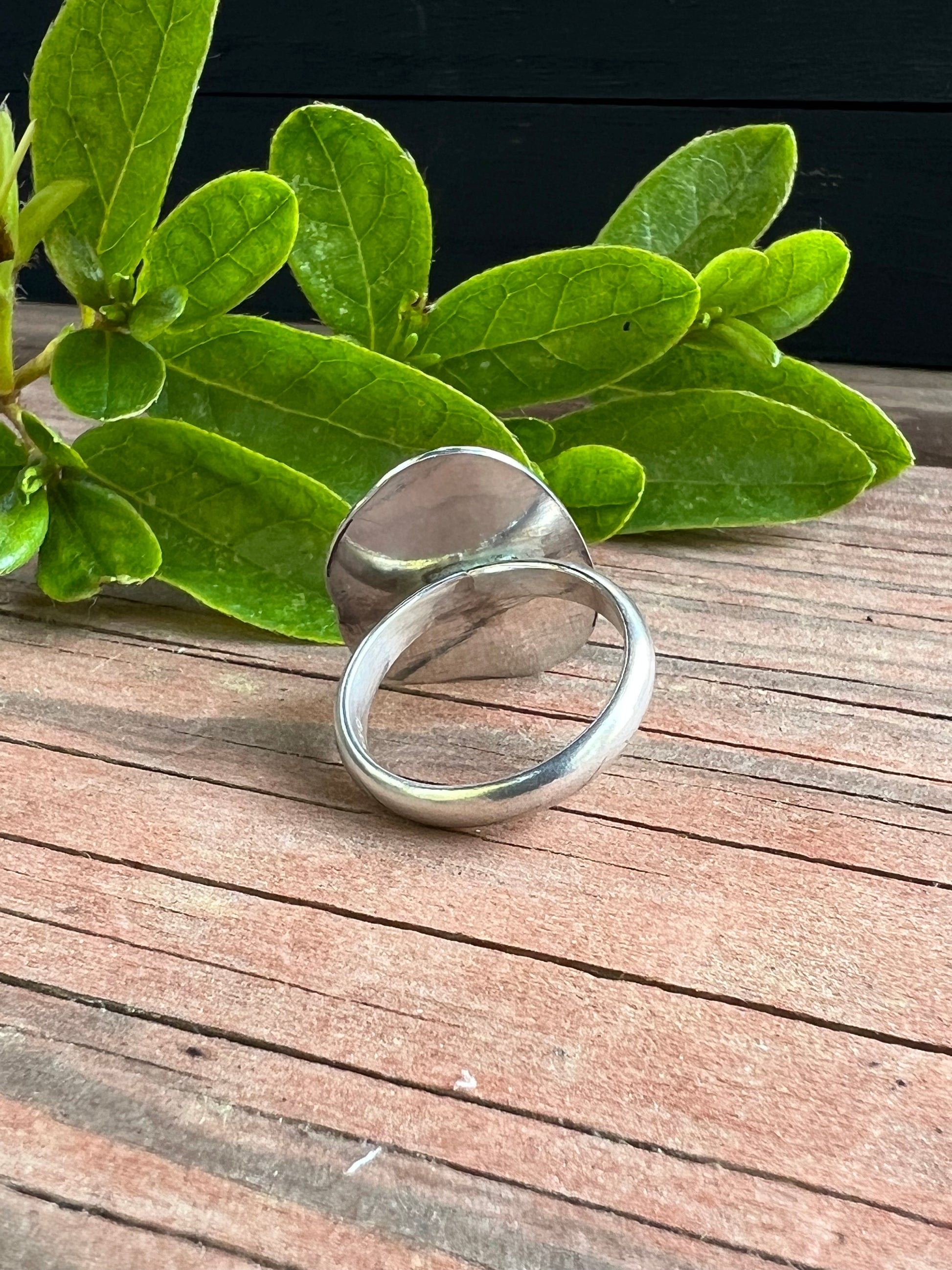 Handmade, one of a kind .925 Sterling Silver and genuine Turquoise ring, size 6.75. This ring features a beaded edge and handmade leaf details.