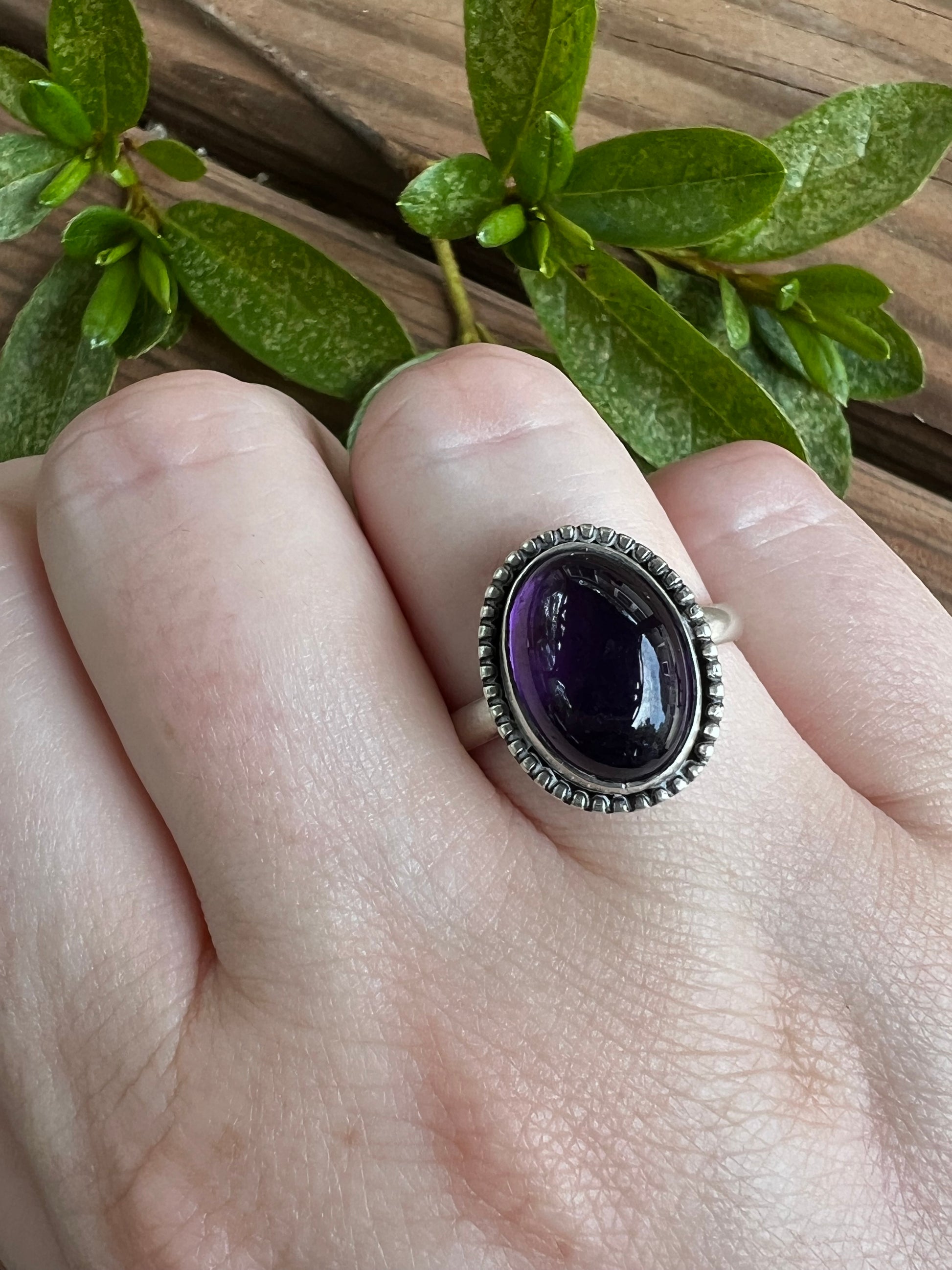 Handmade .925 Sterling SiIver and Amethyst ring, with beaded edge detail, size 8.5.