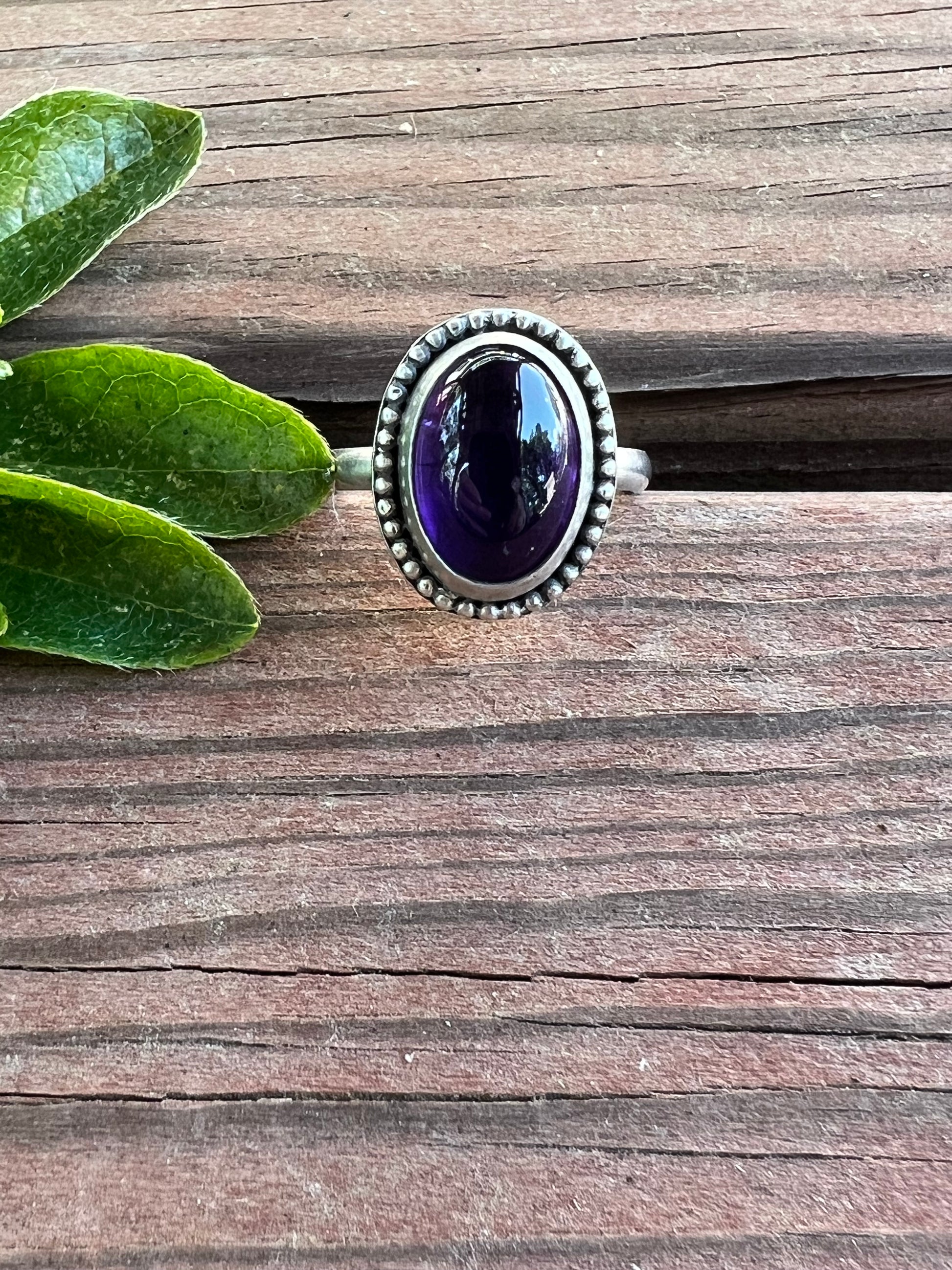 Handmade .925 Sterling SiIver and Amethyst ring with beaded edge detail, size 7.75.