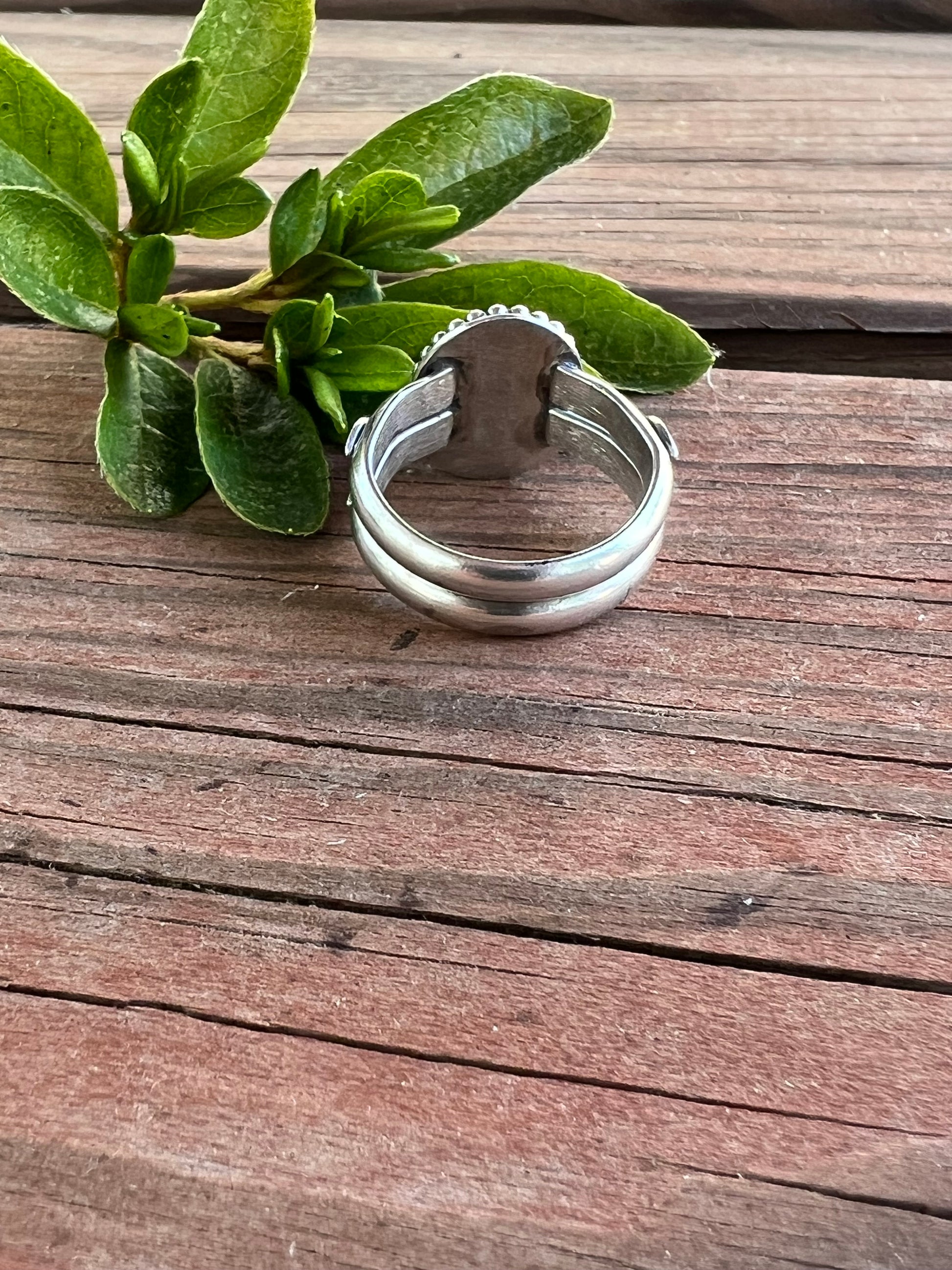 Handmade .925 Sterling Silver and Black Onyx ring with beaded edge detail and moon accents, size 7.5