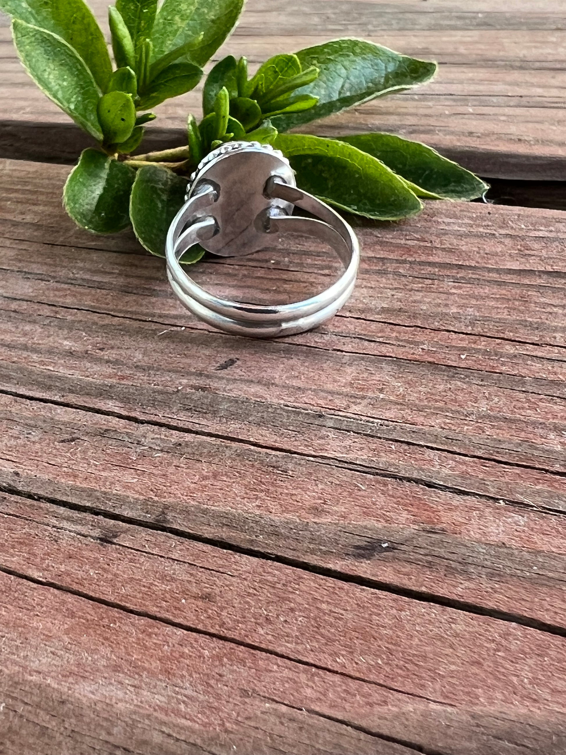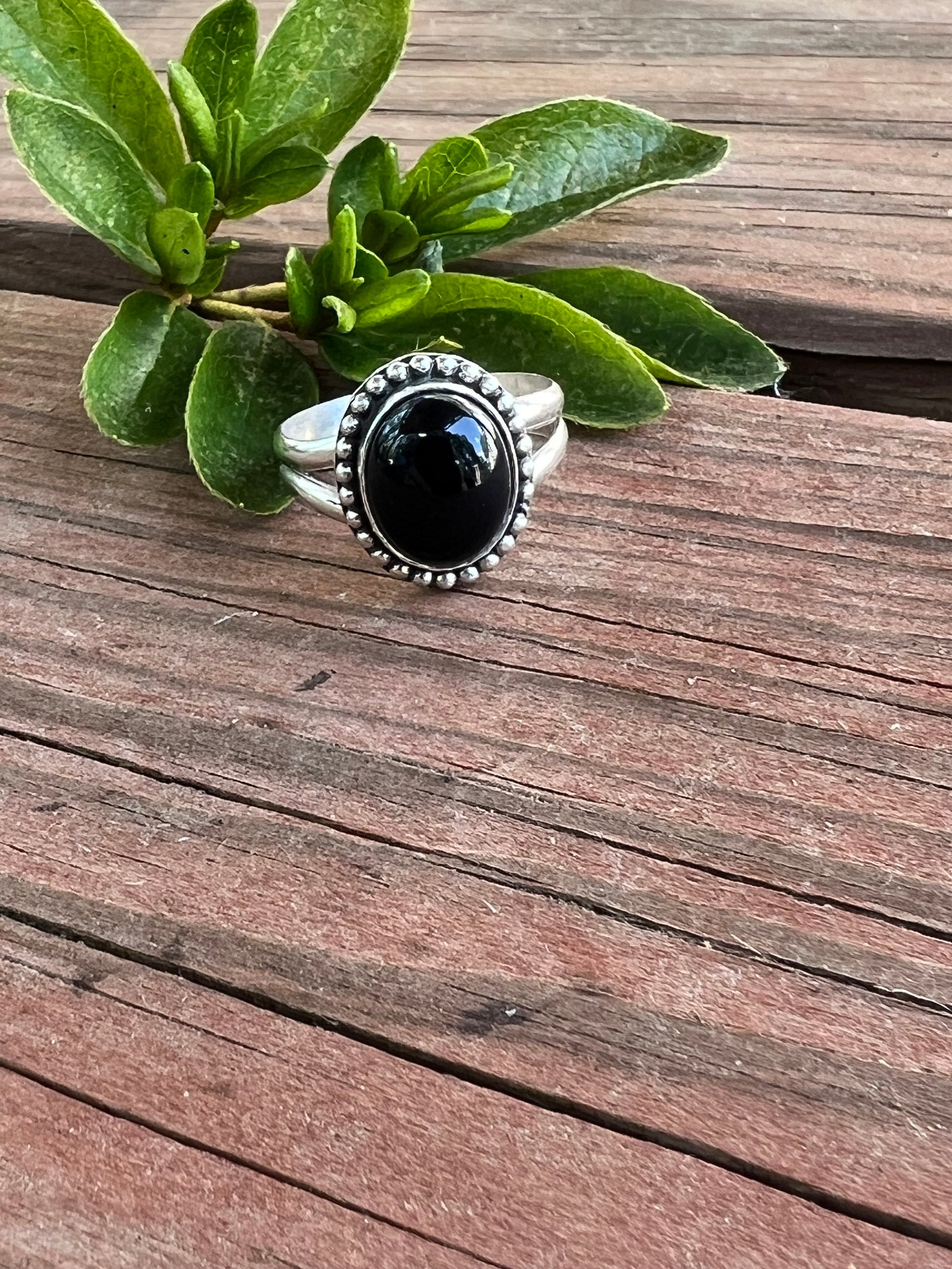 Handmade .925 Sterling SiIver and Black Onyx ring, with beaded edge detail, size 7.5.