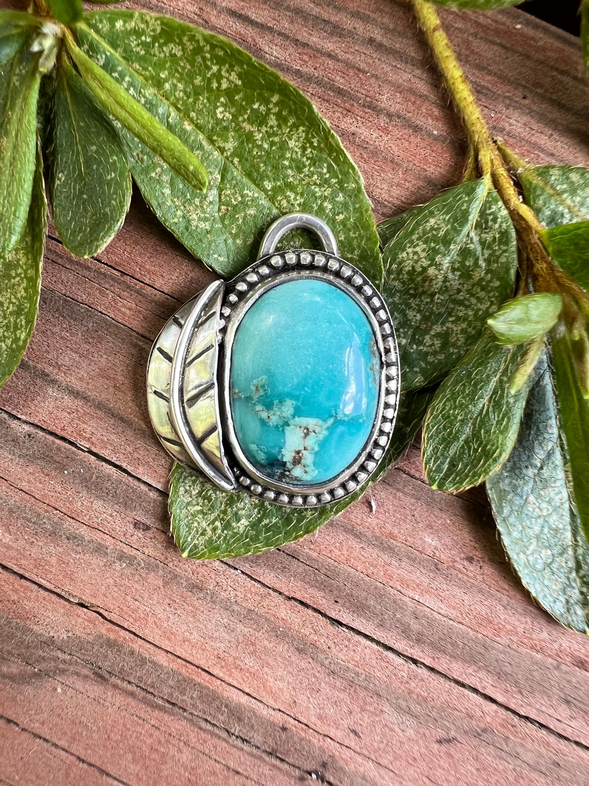 Handmade, one of a kind .925 Sterling Silver and genuine Turquoise pendant with beaded edge and leaf detail.