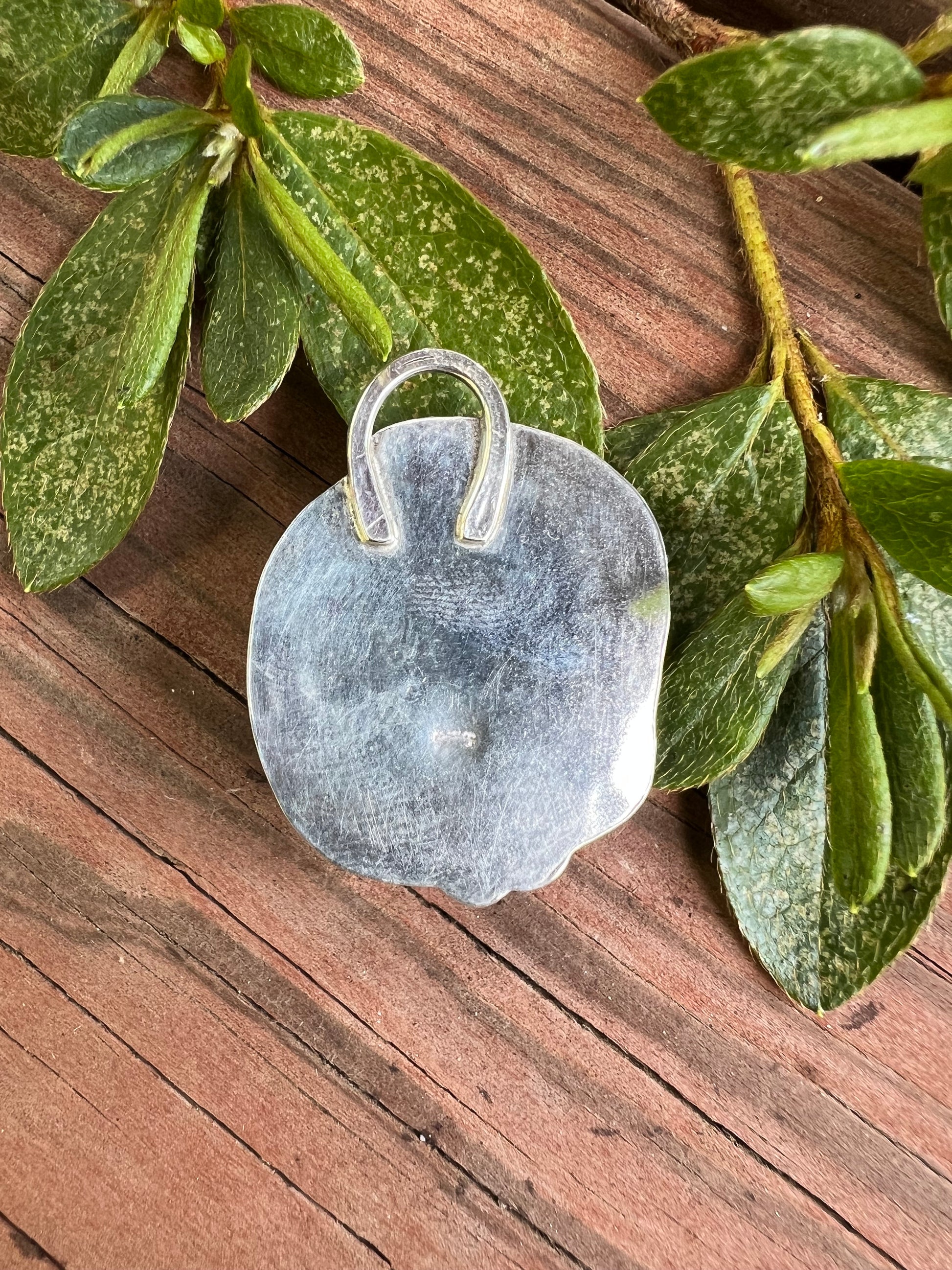 Handmade, one of a kind .925 Sterling Silver and genuine Turquoise pendant with beaded edge and flower and leaf details.