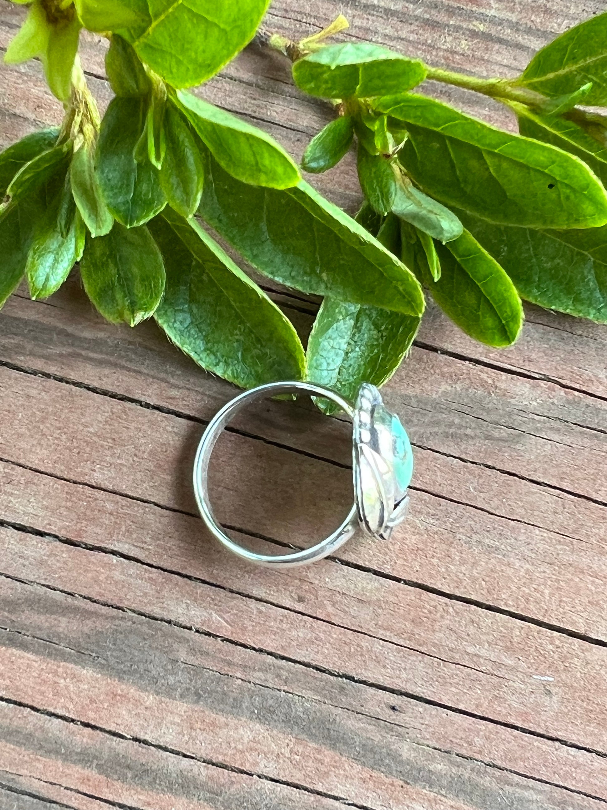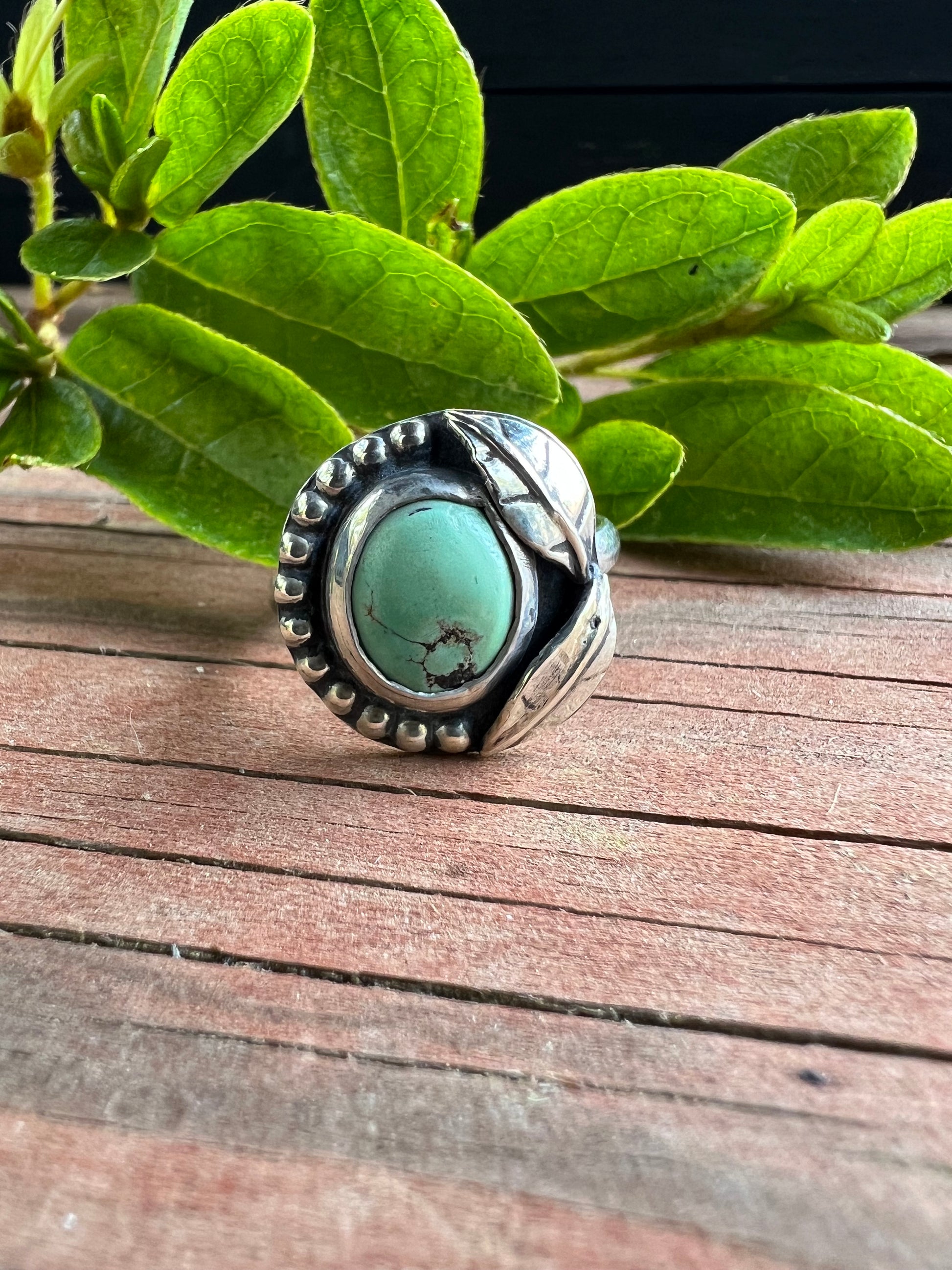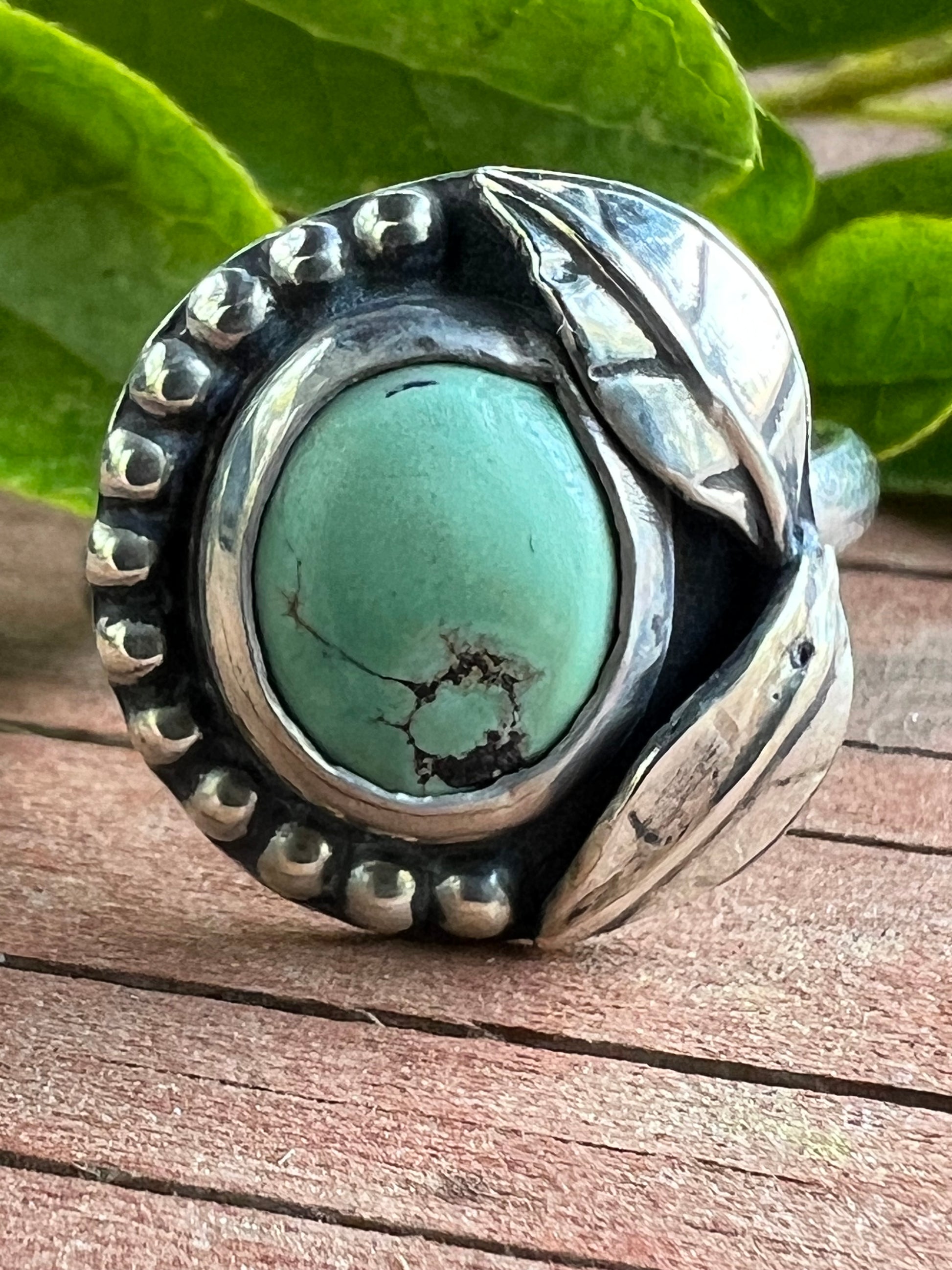 Handmade Sterling Silver and genuine Turquoise Ring, size 8. This ring features a beaded edge and handmade leaf detail.